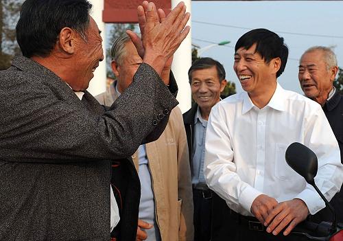 這是2008年10月7日,小崗村新帶頭人、村黨委書記沈浩(前右)與大包干帶頭人關(guān)友江、嚴俊昌、嚴金昌、嚴學(xué)昌交流小崗村的改革發(fā)展情況。新華社記者 王雷 攝