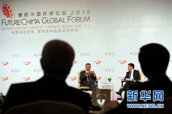 7月21日,新加坡總理李顯龍(左)和新加坡《聯(lián)合早報(bào)》總編輯吳新迪出席在新加坡舉行的“慧眼中國(guó)環(huán)球論壇”2015年年會(huì)閉幕午宴暨對(duì)話會(huì)。新華社發(fā)(鄧智煒攝)
