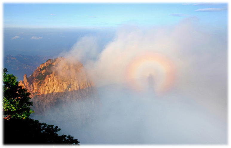 佛光是一種特殊的自然物理現(xiàn)象,其形成原因是太陽自觀賞者身后,將人影投射到前面的云霧上面,云霧中細小水滴或冰晶形成獨特的圓圈形彩虹,觀賞者身影正在其中,即使是三、五人同行,也只能見到自己,不見別人。