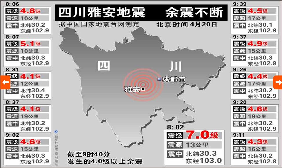 中國(guó)臺(tái)灣網(wǎng)4月20日消息 四川雅安蘆山縣4月20日8:02發(fā)生7.0級(jí)地震,震源深度13公里。截止上午9:40,發(fā)生多起4.0級(jí)以上余震。(據(jù)中國(guó)國(guó)家地震臺(tái)網(wǎng))