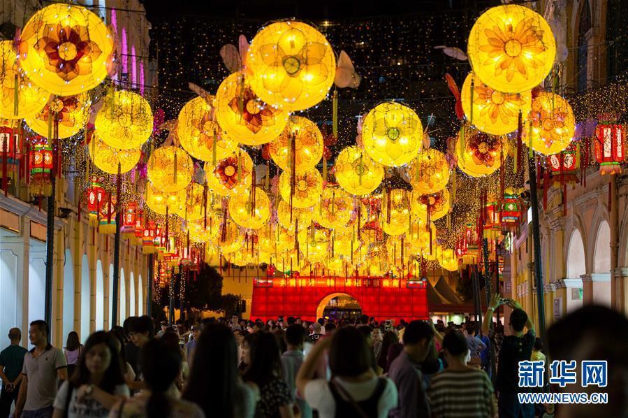 資料圖:市民和游客在澳門議事亭前地觀看中秋節燈飾。新華社記者 張金加 攝