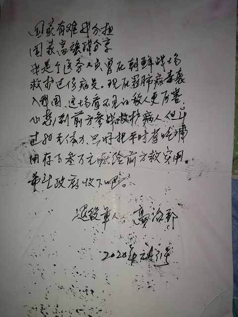 “國家有難我分擔,國家富強我分享。我是一名醫務人員,曾在朝鮮戰場救護過傷病員。現在新型冠狀病毒襲入我國,看不見的敵人更厲害,想到前方救護病人,但年過80無體力,只好把平時省吃儉用存下來的3萬元獻給前方救災用,希望政府收下。”