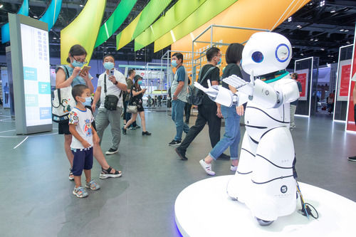 觀眾在2020年中國(guó)國(guó)際服務(wù)貿(mào)易交易會(huì)上觀看一款智能機(jī)器人(9月8日攝)。新華社記者 徐金泉 攝