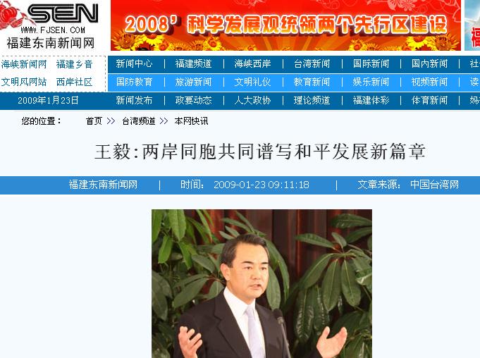 中共中央臺辦、國務院臺辦主任王毅今天向臺灣同胞發表2009年新春賀辭——《兩岸同胞共同譜寫和平發展新篇章》