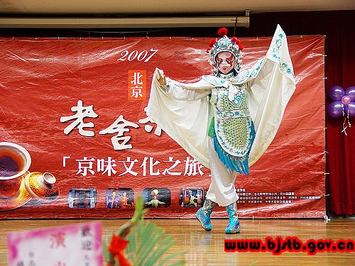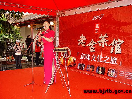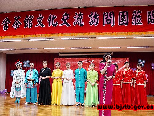 2007年1月2日至11日,由北京老舍茶館演出人員組成的,集京味文化、茶文化、戲曲文化于一身的第七屆“京味文化之旅”展演團,應臺灣中華中道學會邀請來到寶島臺灣,先后在云林縣虎尾鎮布袋戲主題館、臺中耕讀園、臺北縣坪林茶葉博物館、臺北縣淡水紅樓茶館、臺北紫藤廬茶藝館和鶯歌鎮活動中心進行了四場演出和兩場交流。老舍茶館獨具濃郁京味、京腔、京韻特色的展演,被譽為“茶與文化藝術的結合”,令島內民眾看得如醉如癡,場場爆滿,受到了大批觀眾的喜愛。很多臺灣觀眾看完演出后意猶未盡,紛紛表示要到北京來看一個“原汁原味的老舍茶館”。