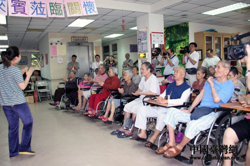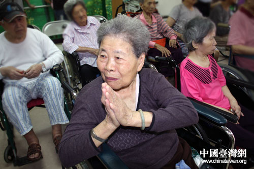 “高山青、澗水藍(lán)……”在“超女”李娜悠揚(yáng)及極富帶動(dòng)性的歌聲中,嘉義利河伯養(yǎng)老院的70余位老人一起唱起了這首傳唱度極高的報(bào)道歌曲。“哈利路亞,”生活在這里的張林滿(mǎn)老人在歌聲中淚流滿(mǎn)面,“這是我很熟悉的旋律,她長(zhǎng)的很清秀,看到她活潑的樣子就像看到了自己的孩子一樣,很溫暖”。雖然老人夾雜著閩南語(yǔ)的普通話(huà)記者并不能完全聽(tīng)懂,但她眼中的淚水卻代表了千言萬(wàn)語(yǔ)。