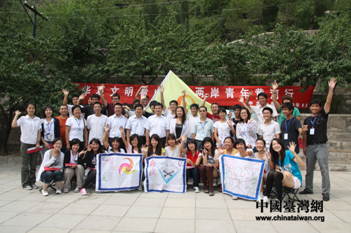 兩岸青年在二龍山愛心臺拓展訓練場地合影留念,第一排三面旗幟為三個競賽小隊隊旗(中國臺灣網 陳寧 攝)