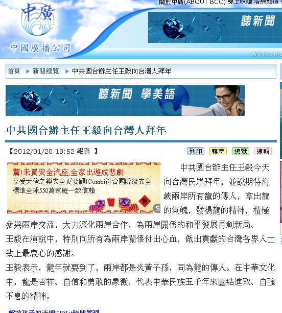 中共國(guó)臺(tái)辦主任王毅今天向臺(tái)灣民眾拜年,並說(shuō)期待海峽兩岸所有龍的傳人,拿出龍的氣魄,發(fā)揚(yáng)龍的精神,積極參與兩岸交流,大力深化兩岸合作,為兩岸關(guān)係的和平發(fā)展再創(chuàng)新局。