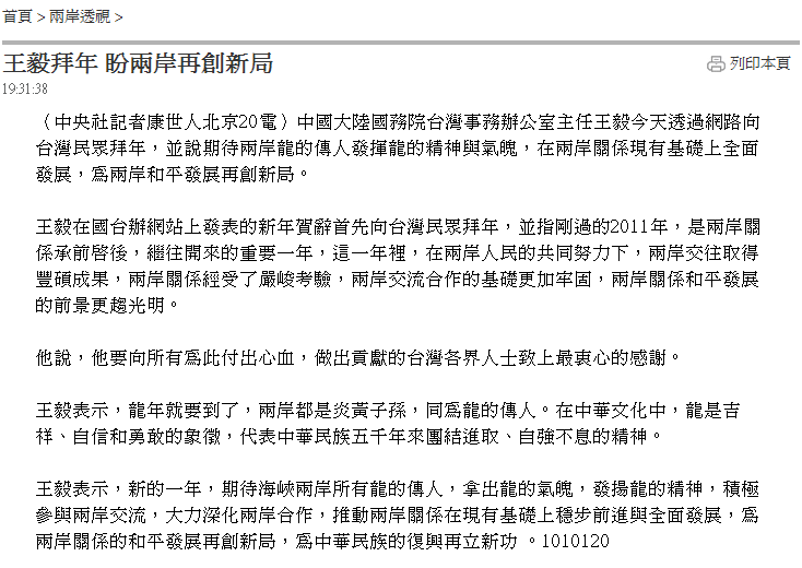 (中央社記者康世人北京20電)中國大陸國務院臺灣事務辦公室主任王毅今天透過網路向臺灣民眾拜年,並說期待兩岸龍的傳人發揮龍的精神與氣魄,在兩岸關係現有基礎上全面發展,為兩岸和平發展再創新局。