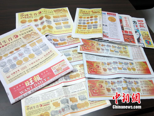 中華錢幣文化是中國文化的一個組成部分,生肖文化更為中華民族所獨有,龍年春節將至,圖為臺灣大洋金幣公司在臺灣《聯合報》、《旺報》、《中華日報》等報刊推介中國人民銀行發行的壬辰龍年生肖金銀紀念幣。