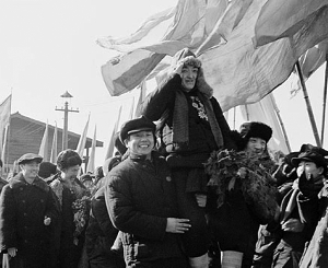 1954年,東北各地的工人和農(nóng)民們?cè)诖汗?jié)期間展開(kāi)盛大的工農(nóng)聯(lián)歡活動(dòng)。圖為東北各省農(nóng)業(yè)勞動(dòng)模范參觀團(tuán)到達(dá)遼寧省鞍山市時(shí),受到工人們的熱烈歡迎。資料圖片