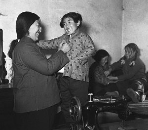 1954年春節(jié),河北省唐山解家套農(nóng)業(yè)生產(chǎn)合作社的小女孩陳小翠正在試穿媽媽剛做好的新衣。資料圖片