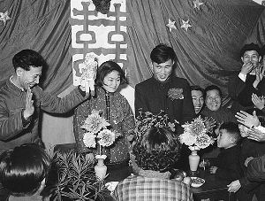 春節(jié)是結(jié)婚的好日子。這是1957年春節(jié),遼寧省沈陽(yáng)風(fēng)動(dòng)工具廠的工人鞠復(fù)海(新郎)和俞鳳仙(新娘)在婚禮儀式上接受朋友們的祝賀。資料圖片