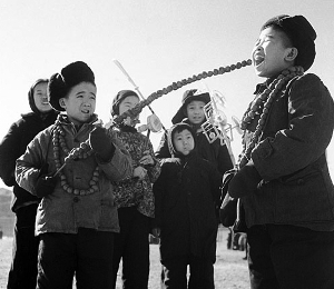 1961年春節(jié),北京逛廠甸廟會(huì)的孩子們最感興趣的是大串糖葫蘆。資料圖片