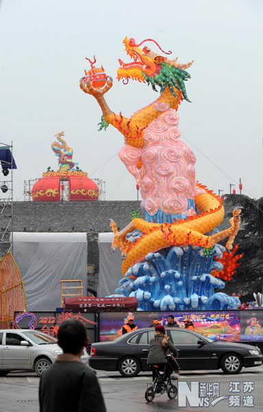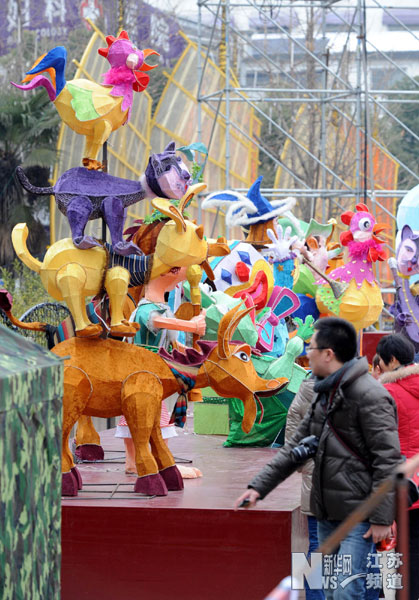 新華網江蘇頻道南京1月18日電 17日,參加2012江蘇 臺灣燈會交流展示活動的一組臺灣花燈在南京中華門安裝到位,吸引市民前來參觀。本次展示是南京夫子廟秦淮燈會內容之一,設“金帆迎風”“松雪映輝”“心心相印”“喜映彩蝶”等不同風格的燈展區,以40多座浪漫創意造型花燈營造新春歡樂氛圍。(新華社記者 孫參攝)
