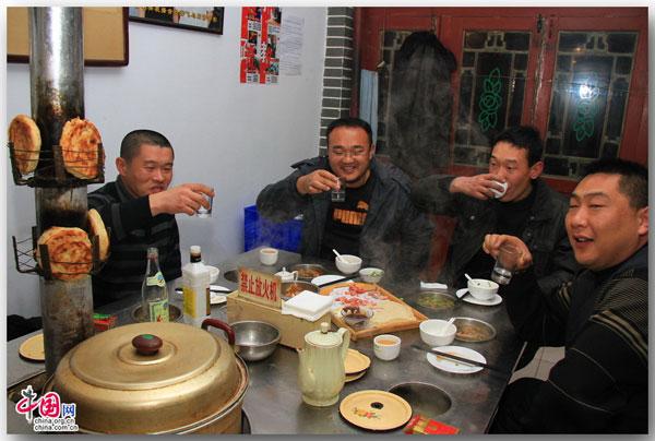 過小年了,朋友歡聚小酌,周村的老百姓知足快樂。周村的煮鍋很特色。鞏俐、葛優(yōu)和張豐毅等明星大腕都曾經(jīng)在丁家煮鍋大飽口福。爐面上放一塊大桌面,桌面上固定放有十幾個菜碗。客人每人一碗,隨吃隨添,非常方便、衛(wèi)生,據(jù)說這事是中國最早實行的分餐制呢。切一碗煮鍋,啃上兩個烤得外焦里軟的火燒,喝上點湯,渾身冒著熱乎氣兒,心里暖洋洋的。濃濃的老湯在胃里彌散開來,是一種悠久與厚重,一抹回憶,一份思緒。 張愛東 攝