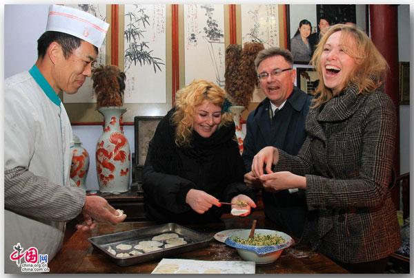 中國年要包餃子,吃慣了面包的老外對中國餃子很有興趣,他們在周村家庭飯店里學包餃子格外開心。 張愛東 攝