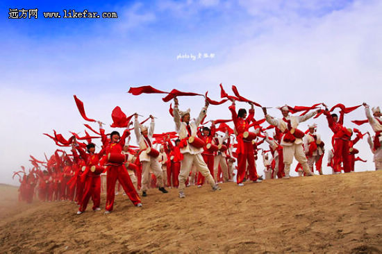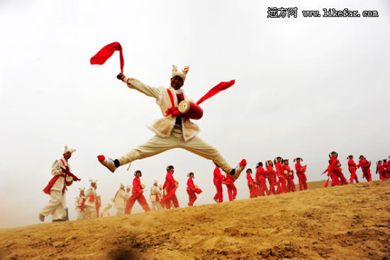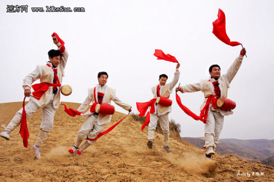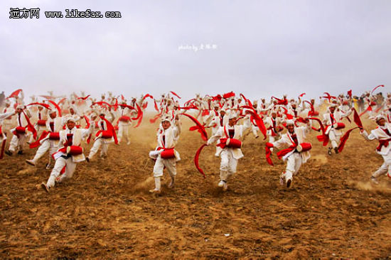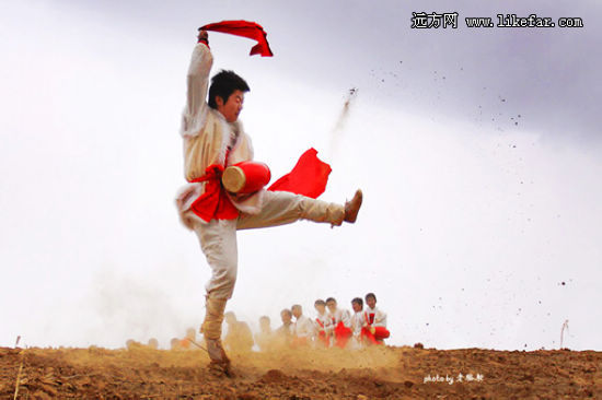 農(nóng)歷正月里是看安塞腰鼓最好的時(shí)間,尤其是元宵節(jié)前后。其他時(shí)間,表演腰鼓的老鄉(xiāng)們不是在外地演出,就是在田間地頭忙農(nóng)活,只有春節(jié)才是他們真正一展身手的時(shí)候!當(dāng)厚重的土地被騰躍的千百漢子踢轉(zhuǎn)出漫天的黃沙,才能讓觀者體會出這古老藝術(shù)真正的生命力之所在。
