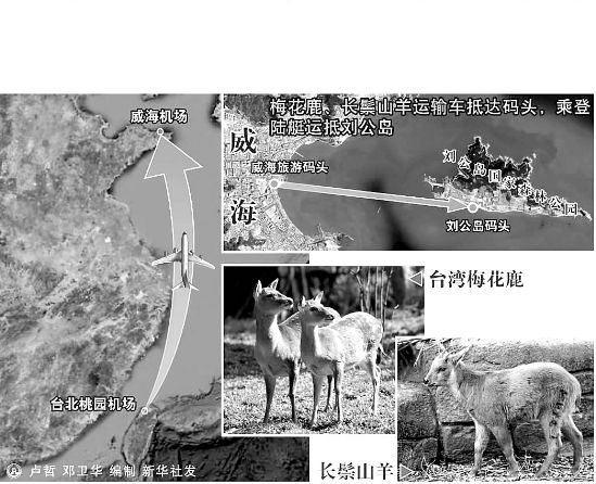 臺灣同胞贈送大陸的梅花鹿“繁星”“點點”、長鬃山羊“喜羊羊”“樂羊羊”4月16日正式入住山東威海劉公島國家森林公園。