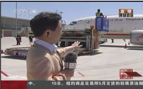 長鬃山羊“喜洋洋”、“樂洋洋”以及梅花鹿“繁星”和“點點”抵達機場后,被小心的運下飛機。圖片來源:中央電視臺