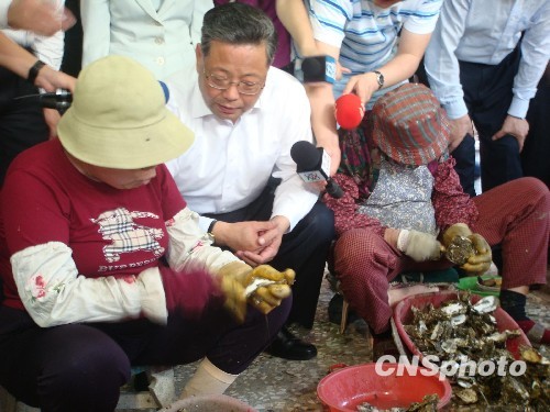 5月9日,正率團在臺訪問的福建省長黃小晶(中)在臺南市參訪路上,下車走進路邊人家,與正在剝海蠣的婦女親切交流。黃小晶5日率福建省經貿文化交流團抵臺展開為期6天的“走親訪友做生意”之行。 中新社發 羅欽文 攝