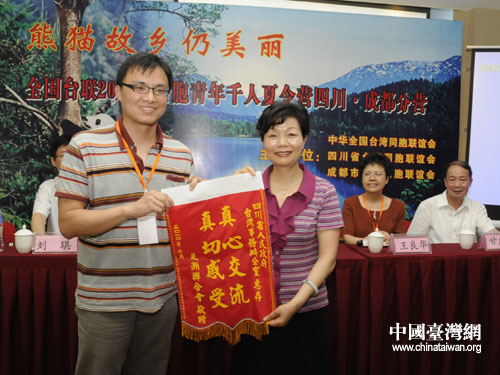 開營式上,成都市臺聯(lián)會長王良華向營員授營旗,并與臺灣夏潮聯(lián)合會互贈禮品。