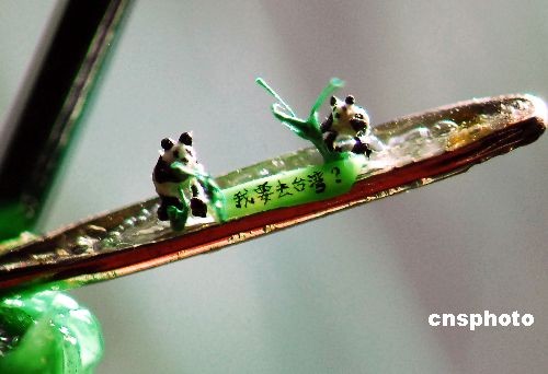 為了迎接12月23日大熊貓“團團”、“圓圓”的到來,臺灣著名微雕家陳逢顯特地花了半個多月的時間,以樹脂凝膠為材質,雕刻了一雄、一雌兩只坐在繡花針孔中的立體大熊貓,拉著寫有“我要去臺灣”的條幅。以表達他對團團、圓圓到來喜悅的心情。中新社發(fā) 陳立宇 攝