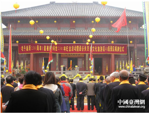 中國臺灣網(wǎng)4月1日三門峽消息 3月30日,老子誕辰2581周年《道德經(jīng)》問世2501年紀(jì)念活動暨函谷關(guān)歷史文化旅游區(qū)4A級景區(qū)揭牌儀式在靈寶市函谷關(guān)大道院隆重舉行。中國老子文化發(fā)展公益基金管委會主任何俊昆、臺灣朝圣團總團長林秋雄、河南省旅游局副局長張鳳有、三門峽市副市長李琳等出席紀(jì)念活動。