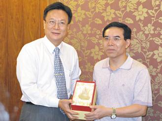 彰化縣長卓伯源(左)贈送河北省委常委聶辰席(右)一座“彰化大佛”雕塑,兩人都說未來將加強推動雙方的交流與合作。圖片來源:經濟日報