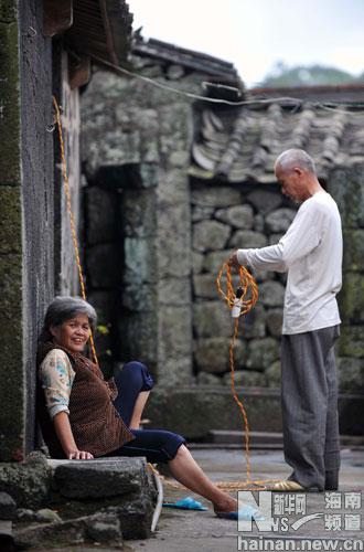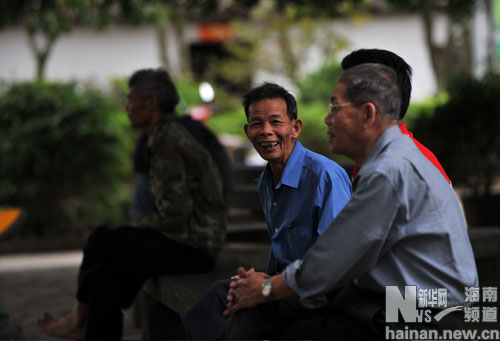 海南省海口市石山鎮美社文明生態村的幾位老人在村中的文化廣場上聊天(1月6日攝)。