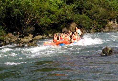 臨近終點時,我們的船槳才完完全全地派上了用場,這里水流平緩,船在水中徘徊不前,不得不齊心合力地劃動著槳。此時,樂趣來自于與同行船之間的“打水仗”,渾身濕透的我們毫不顧忌地將水潑向對方,一路歡聲笑語,令人回味無窮。全程3小時的漂流之旅,不僅是運動之旅,觀景之旅,還是一次呼吸清新空氣的健康之旅。(謝向榮 特約記者 尹秋艷)