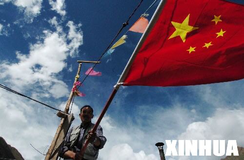 6月30日,西藏堆龍德慶縣的藏族農(nóng)民在掛五星紅旗。當(dāng)日,青藏鐵路沿線的藏族群眾紛紛掛起國旗,喜迎青藏鐵路7月1日全線通車。(新華社記者楊俊江攝)