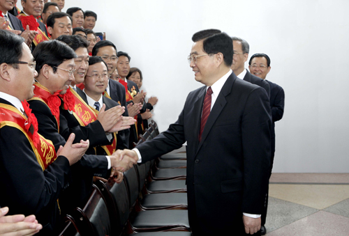 7月1日,中共中央總書記、國家主席、中央軍委主席胡錦濤專程前往青海省格爾木市出席青藏鐵路通車慶祝大會。這是胡錦濤在會前親切接見青藏鐵路建設先進集體和先進個人代表。(新華社記者蘭紅光攝)