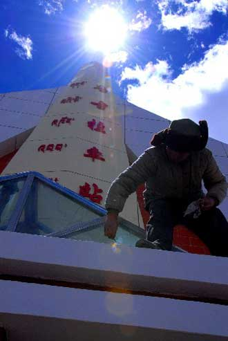 一名工人在仰望藏羚羊造型的沱沱河車站