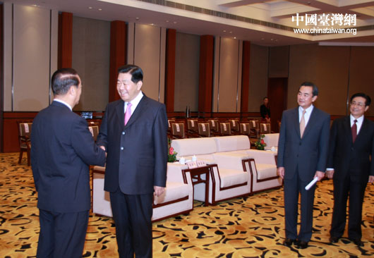 11月7日晚,中共中央政治局常委、全國(guó)政協(xié)主席賈慶林在寧波會(huì)見率團(tuán)出席兩岸農(nóng)漁水利合作交流會(huì)的親民黨主席宋楚瑜一行。(中國(guó)臺(tái)灣網(wǎng) 鐘寶華 攝)