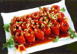 “九轉(zhuǎn)大腸”是山東濟(jì)南的傳統(tǒng)名菜。在清光緒年間,濟(jì)南九華林酒樓店主,把豬大腸(直腸)經(jīng)洗刷后,加香料用開水煮至硬酥,取出切段,加醬油、糖、香料等調(diào)味,首先制成了香肥可口的“紅燒大腸”,贏得顧客的歡迎,逐漸聞名于市。后來在制作方法上又有所改進(jìn),即將洗凈大腸入開水鍋中煮熟后,先入油鍋中炸,然后再加調(diào)料和香料烹制,使“紅燒大腸”的味道更為鮮美。許多著名人士在該店設(shè)宴時(shí)均備“紅燒大腸”一菜。一些文人雅士食后,感到此菜確實(shí)與眾不同,別有滋味,為取悅店家喜“九”之癖,并稱贊廚師制作此菜像道家“九煉金丹”一樣精工細(xì)作,便將其更名為“九轉(zhuǎn)大腸”。從此“九轉(zhuǎn)大腸”一菜便馳名全省,成為山東最著名的菜肴之一。