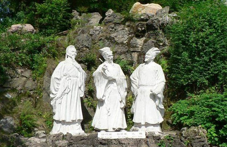 三游洞得名于唐代三個(gè)大文豪。唐元和十四年(公元819年),大詩(shī)人白居易由江州改任忠州刺史赴任途中,與其弟白行簡(jiǎn)途經(jīng)夷陵(宜昌古稱(chēng)),在此遇到大詩(shī)人元稹。三人結(jié)伴到西陵山一游。發(fā)現(xiàn)這個(gè)“天生一洞”。三位詩(shī)人各賦詩(shī)一首,并由白居易“序而記之”。因此洞由他們?nèi)耸加危实妹叭味础薄?37年后北宋年間,又有三位文豪蘇洵、蘇軾和蘇轍父子同游此洞。同樣蘇氏父子也各題詩(shī)一首,留于洞壁。白氏兄弟與元稹之行,稱(chēng)為“前三游”;蘇氏父子之行,稱(chēng)為“后三游”。在三游洞旁的崖壁還刻有抗戰(zhàn)時(shí)期的愛(ài)國(guó)名將馮玉祥題寫(xiě)的“是誰(shuí)殺害了我們的父母兄弟”十二個(gè)大字。