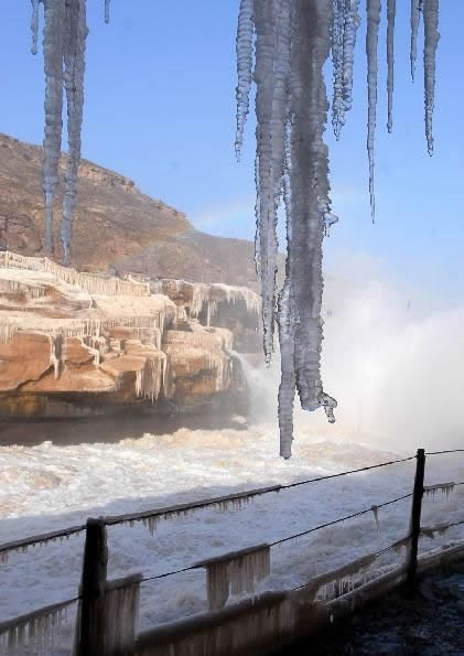 12月7日,受連日來的強冷空氣影響,地跨晉陜兩省的黃河壺口瀑布景區瀑布、冰掛、冰雕、彩虹景觀同時呈現在人們眼前,吸引了眾多游人和攝影愛好者。