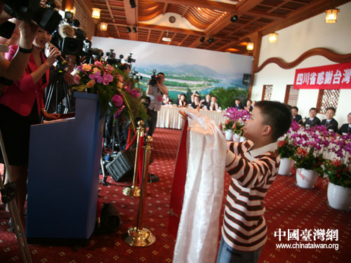 熱烈的掌聲中,四川6個(gè)地震重災(zāi)市州的負(fù)責(zé)人和抗震救災(zāi)小英雄林浩、著名藏族藝人容中爾甲、羌族藝人茍利芝代表災(zāi)區(qū)人民為臺(tái)灣的參會(huì)代表獻(xiàn)上尊貴的哈達(dá)和羌紅,向所有去過地震災(zāi)區(qū)施救的團(tuán)體、組織,向所有關(guān)注、關(guān)心四川地震災(zāi)區(qū)的臺(tái)灣同胞,表示誠(chéng)摯的感謝和真誠(chéng)的祝福。林浩和李月兩位小朋友分別用質(zhì)樸的歌聲和深情的詩(shī)歌朗誦表達(dá)四川人民、災(zāi)區(qū)人民對(duì)臺(tái)灣同胞的深深感激之情。