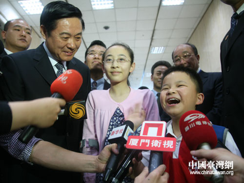 劉奇葆在機(jī)場(chǎng)為大家介紹來自四川地震災(zāi)區(qū)的小朋友林浩和李月。圖片來源:四川省臺(tái)辦