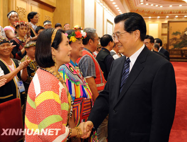8月19日,中共中央總書記胡錦濤在北京人民大會堂會見高金素梅率領的臺灣少數民族代表團。新華社記者李學仁攝