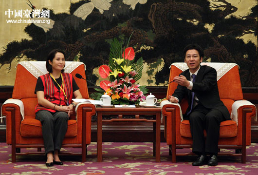 高金素梅同中國青少年發(fā)展基金會負(fù)責(zé)人賀軍科探討青少年教育問題。(中國臺灣網(wǎng) 鐘寶華 攝)