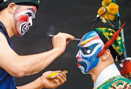 圖為開(kāi)課前臺(tái)灣丑角演員林朝緒(左)幫師弟曾冠東(右)化妝。圖片來(lái)源:臺(tái)灣中國(guó)時(shí)報(bào)