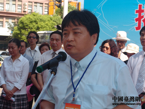 中國國民黨苗栗縣黨部訪問團領(lǐng)隊江村貴在揭牌儀式上致辭。(攝影:陳寧)