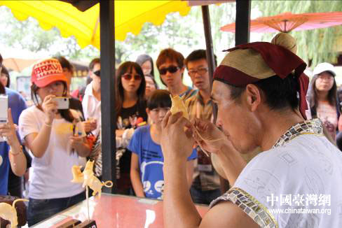 園中薈集民間游藝、雜耍、盤鼓表演,神課算命、博彩、斗雞、斗狗等京都風情,集中展現宋代諸如酒樓、茶肆、當鋪、汴繡、官瓷、年畫等現場制作。每到一處臺灣大學生們都認真地聽、仔細地看。在一個叫“馬大吹”的攤位前,同學們被吹糖泥的藝人所吸引,只見號稱“馬大吹”的藝人手里團著糖泥,往嘴上一放,不一會兒就吹出了一個“大馬”。臺灣嘉義大學宋毓萍學生忍不住感嘆“真能吹啊!中華民間藝術真是多呀!也太神奇了。”