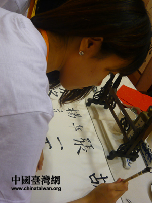 兩岸大學生在中華優秀傳統文化展示和體驗活動中用毛筆書法簽下自己的名字。(中國臺灣網 栗琰 攝)