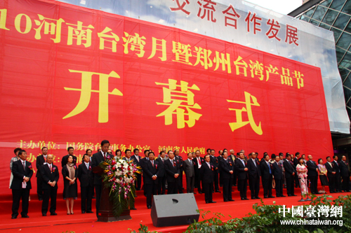 河南省委副書記、省長郭庚茂宣布“2010河南臺灣月暨鄭州臺灣產(chǎn)品節(jié)”開幕。中共中央臺灣工作辦公室、國務(wù)院臺灣事務(wù)辦公室主任王毅,海峽兩岸關(guān)系協(xié)會(huì)副會(huì)長王在希,國務(wù)院臺灣事務(wù)辦公室交流局局長李維一,中華全國臺灣同胞聯(lián)誼會(huì)副會(huì)長王松,中國國民黨中央評議委員會(huì)主席團(tuán)主席徐立德,新黨主席郁慕明,中國國民黨中央評議委員會(huì)主席團(tuán)主席張昌邦等出席開幕式。