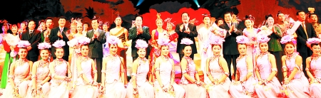 本報(bào)臺(tái)北訊 (記者王大慶)12月15日晚,能夠容納2500人的臺(tái)北中山紀(jì)念館座無虛席,大型樂舞《河洛風(fēng)》在這里精彩上演。中共中央委員、河南省委原書記、省人大常委會(huì)主任徐光春,省委常委、宣傳部長、副省長孔玉芳,省委常委、秘書長曹維新出席,中國國民黨副主席曾永權(quán)夫婦,臺(tái)北世貿(mào)中心董事長王志剛夫婦、國民黨副秘書長張榮恭夫婦應(yīng)邀觀看演出。