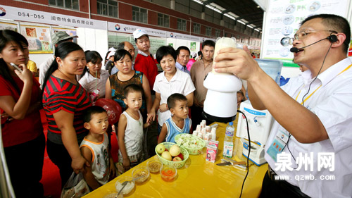 9月6日—8日,首屆海峽兩岸(泉州)農產品采購訂貨會在閩臺農產品市場舉行,一名臺商在推介產品。