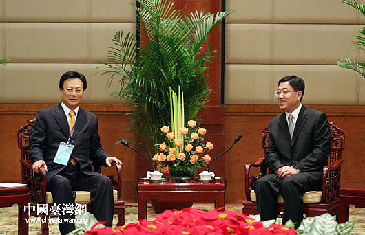 國家旅游局副局長杜江26日會(huì)見來京營銷農(nóng)特產(chǎn)品和旅游的臺中市、彰化縣、臺中縣、南投縣主要負(fù)責(zé)人。杜江同彰化縣縣長卓伯源交談。(中國臺灣網(wǎng) 鐘寶華 攝)